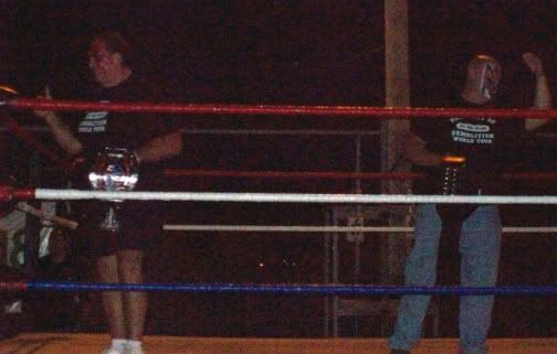 Actually, that guy with the belt there, sports talk radio host Steve "Sparky" Fifer, was part of one of both the low and high points of the night. The low point is that he holds the women's title. Actually though, he was pretty funny and who knew from listening to sports radio 1250 AM that he could pull off being a heel so well. Haha. I'll get to the high point of Sparky's high point in a minute.