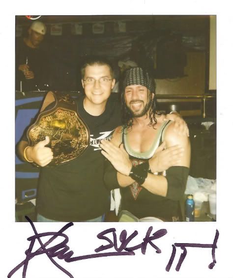 I sat and muddled around for a bit before actually saying fuck it and ponying up the cash to get Sean "XPac" Waltman's autograph. Had a couple minutes to talk to him and he was pretty nice. Word is he's dating WWE Tough Enough 3 finalist Nidea. He seems to be doing well for himself these days, and leaving that outburst on VH1's Surreal Life in the past. Have to say I'm rooting for him to pull through. He's got a talent and if he keeps his bearings can still make a good living for himself and hopefully start a good family one day.