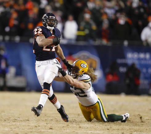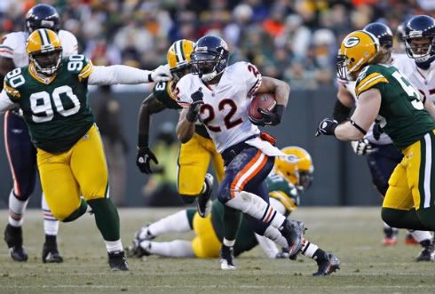 Yes, most of the offensive attention goes to Jay Cutler, but with the production of the pictured above, Matt Forte, the Bears have a guy that for the first time since some player named Walter Payton to run for 1,000 yards and have 500 receiving yards. And to think he did most of that with just about half a season to work after Mike Martz didn't utilize him fully at the start of the season. He said so himself after Sunday night's game to the Chicago Tribune, "If we had run it a little earlier we may have 1,500 or 1,600 yards." He's not looking back and I'm pretty sure the offense not going to Forte more in Sunday's game was a way to not give too much away going into playoffs. He and Chester Taylor are the keys to the offense and are the balance needed from keeping Jay Cutler from going catatonic and throwing balls to the guys in the wrong colored jerseys.